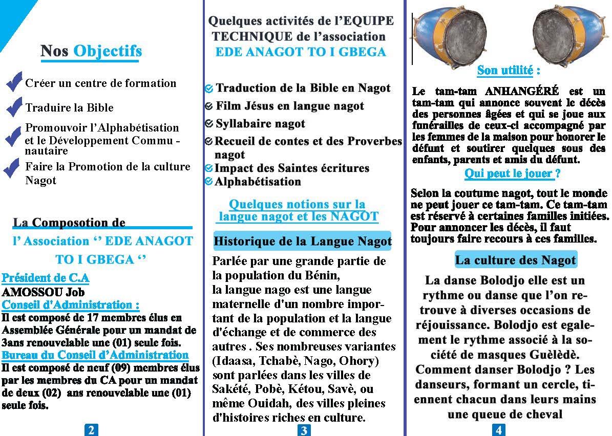 Association ÈDÈ ÀNÀGÓ TÓ ÍGBÉGA est une association à but non lucratif créée et reconnue officiellement. Créer un centre de formation Traduire la Bible Promouvoir l’Alphabétisation Et le Développement Communautaire Faire la Promotion de la culture Nago Impact des Saintes Ecritures